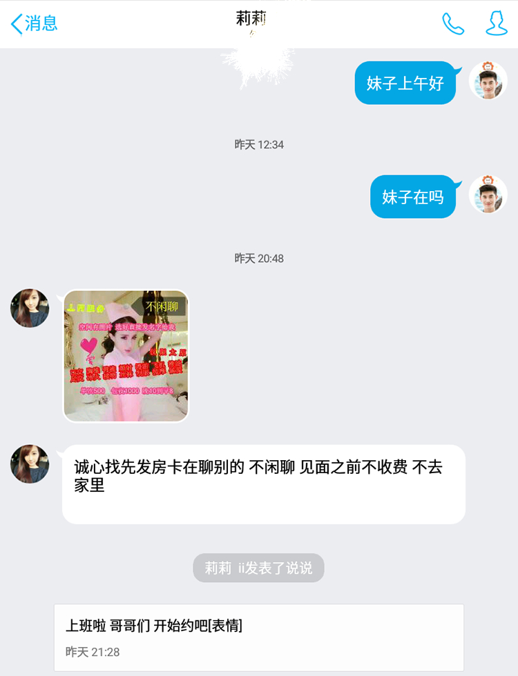 【寻欢细节】:全段时间去太原,闲来没事QQ搜索附近的人,你知道的,有很多那种XXX小妹,然后加上,看看QQ空间,发现此小妹做了很久了,坚持下来了,应该是有理由的,当时是在一人闲来无事,随后问了价钱,看来看500两个小时,包括内容很多,基本就是哪些项目吧。之后要求发房卡,联系好,就是等待了。大概一个小时后到了。之后进入正题。